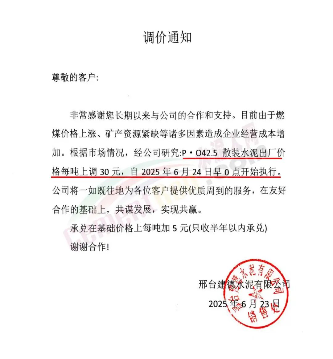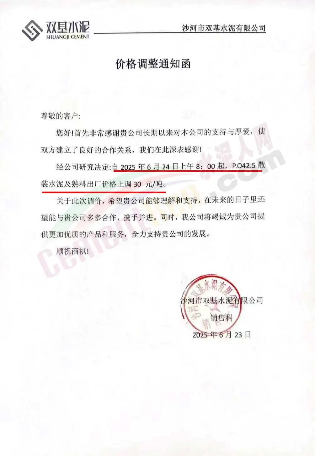 沙河市雙基水泥有限公司通知,經(jīng)公司研究決定自2025年6月24日上午8時(shí)起,P042.5散裝水泥及熟料出廠價(jià)格上調(diào)30元/噸。