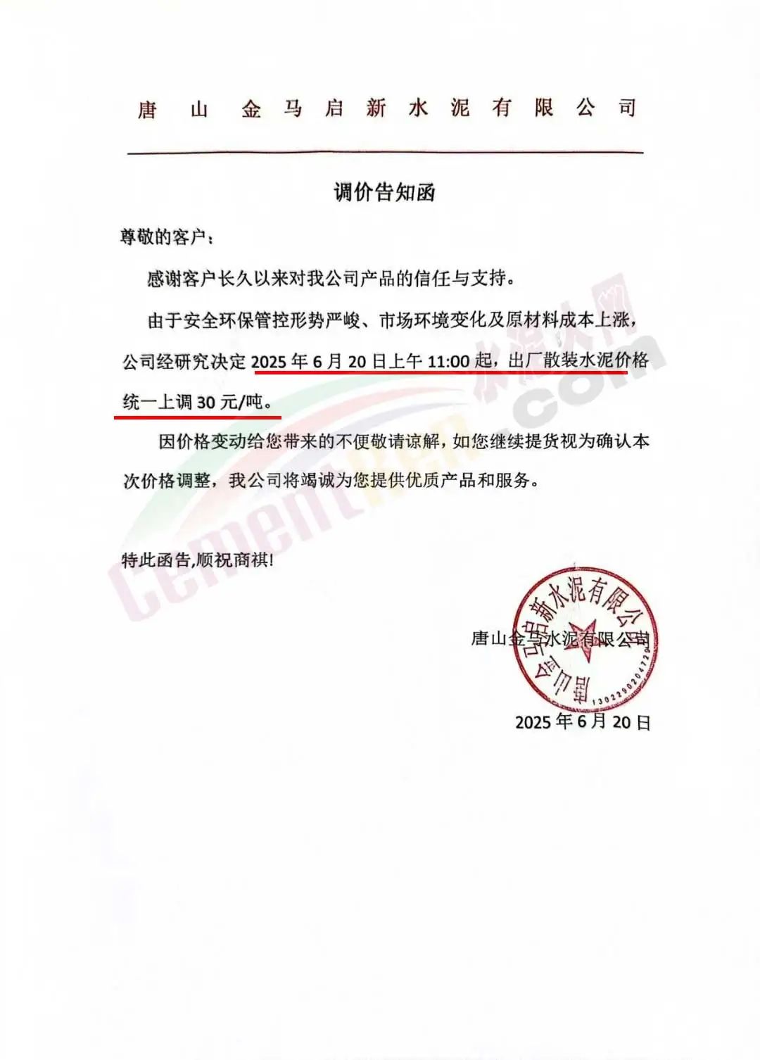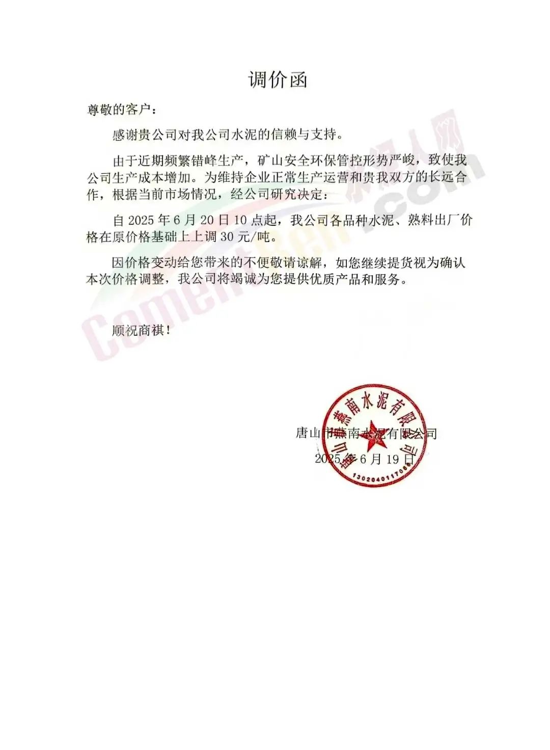 唐山市燕南水泥有限公司通知,由于近期頻繁錯(cuò)峰生產(chǎn),礦山安全環(huán)保管控形勢嚴(yán)峻,致使公司生產(chǎn)成本增加。為維持企業(yè)正常生產(chǎn)運(yùn)營,根據(jù)當(dāng)前市場情況,經(jīng)公司研究決定:自2025年6月20日10點(diǎn)起,公司各品種水泥、熟料出廠價(jià)格在原價(jià)格基礎(chǔ)上上調(diào)30元/噸。