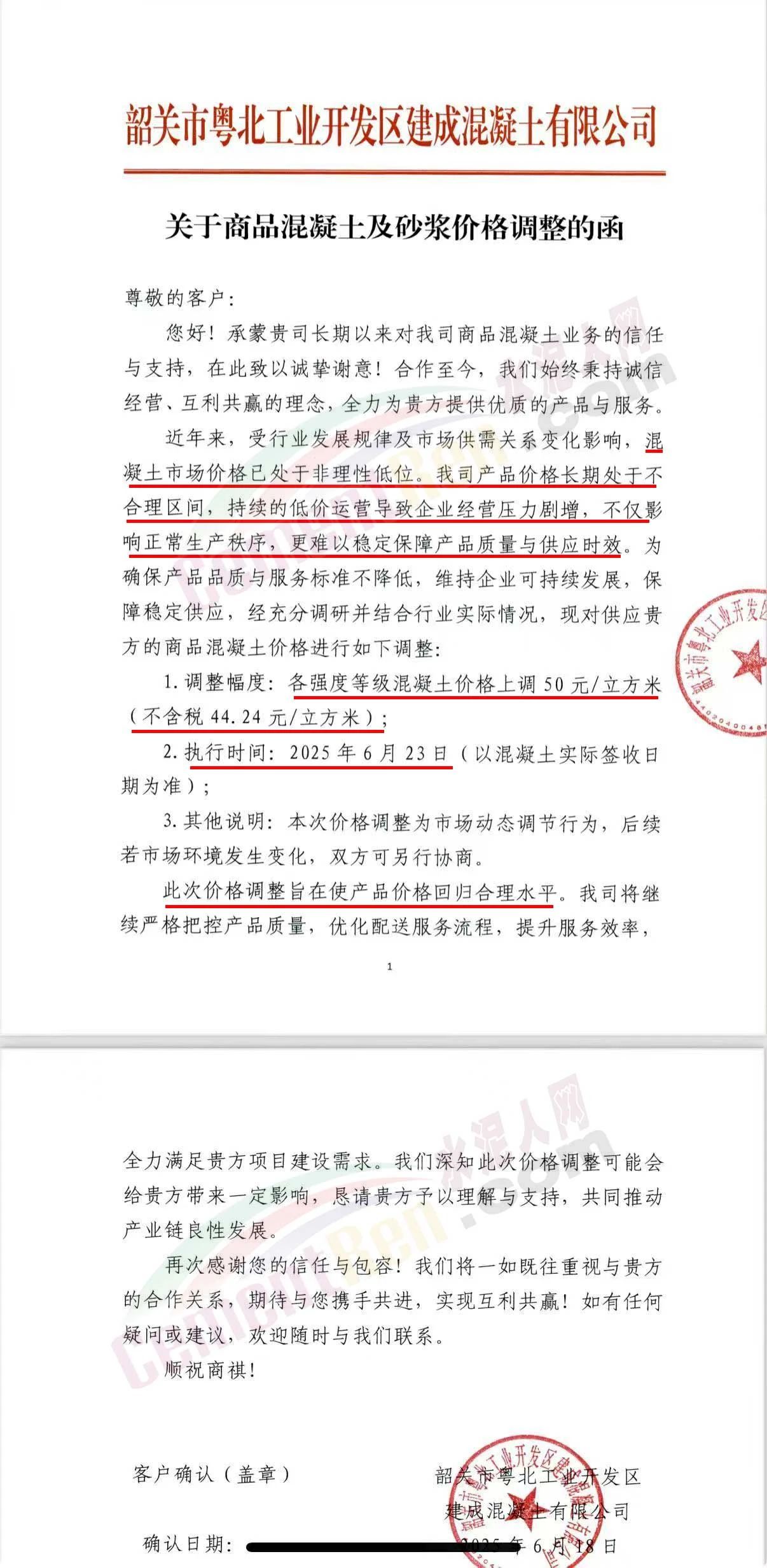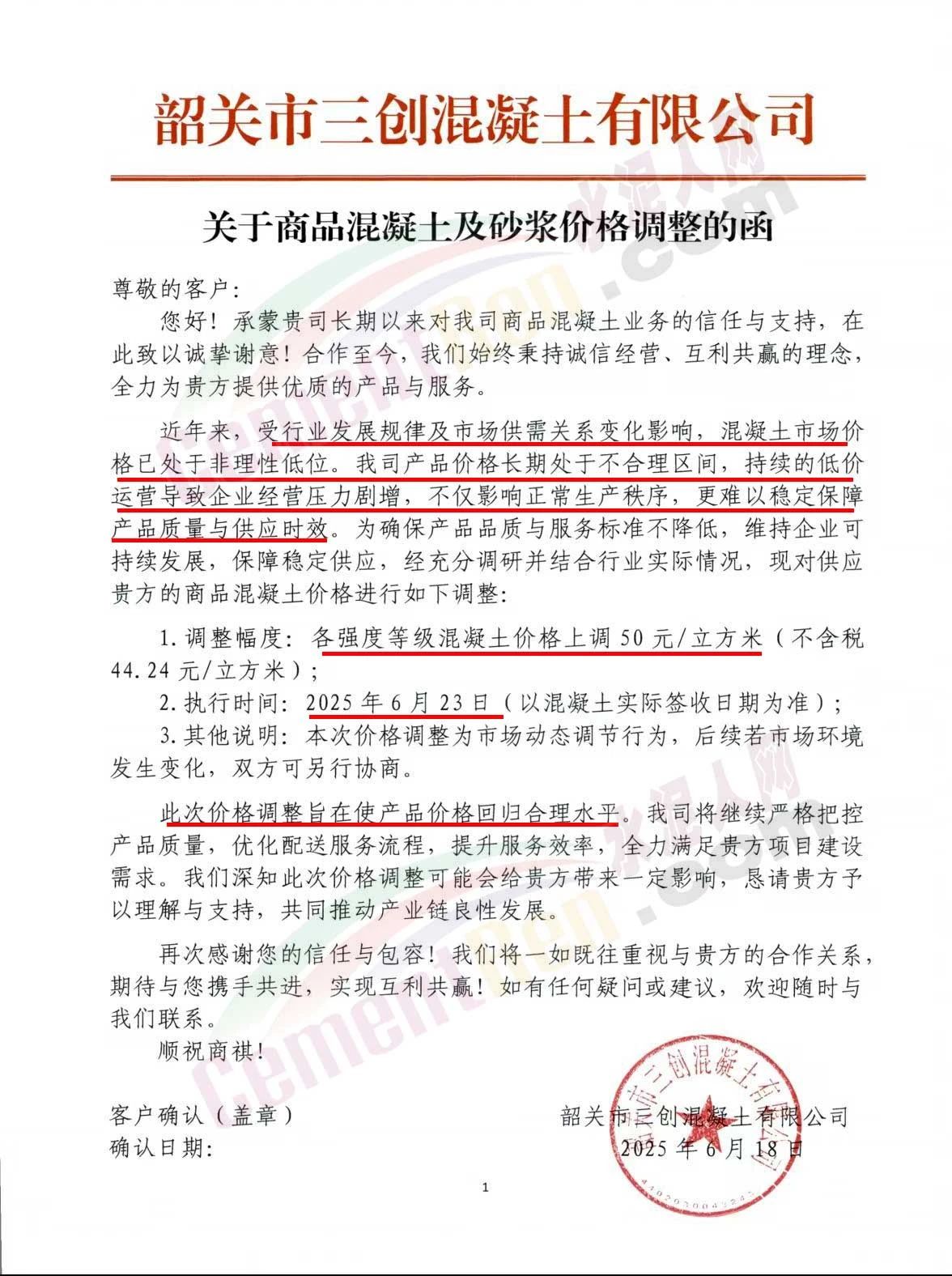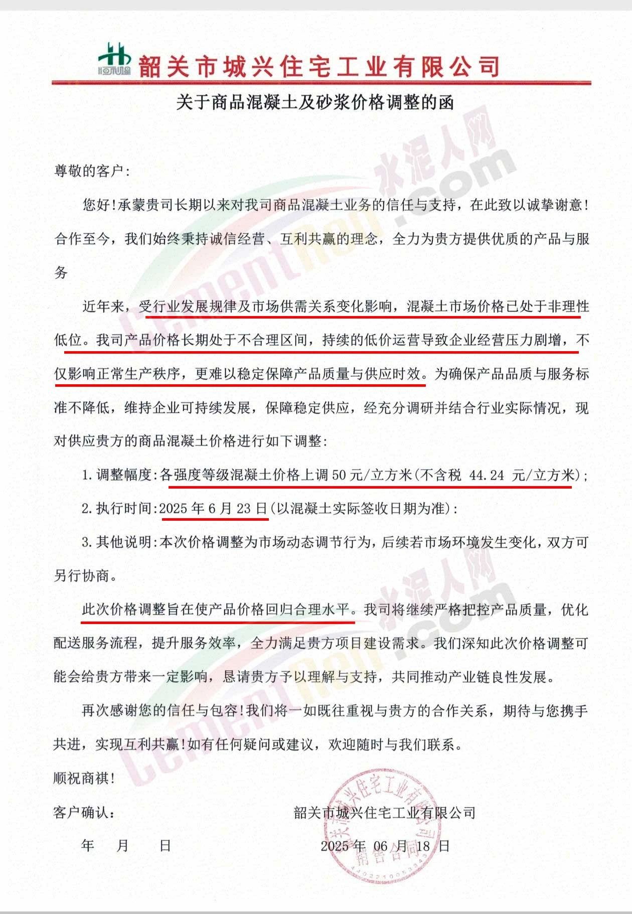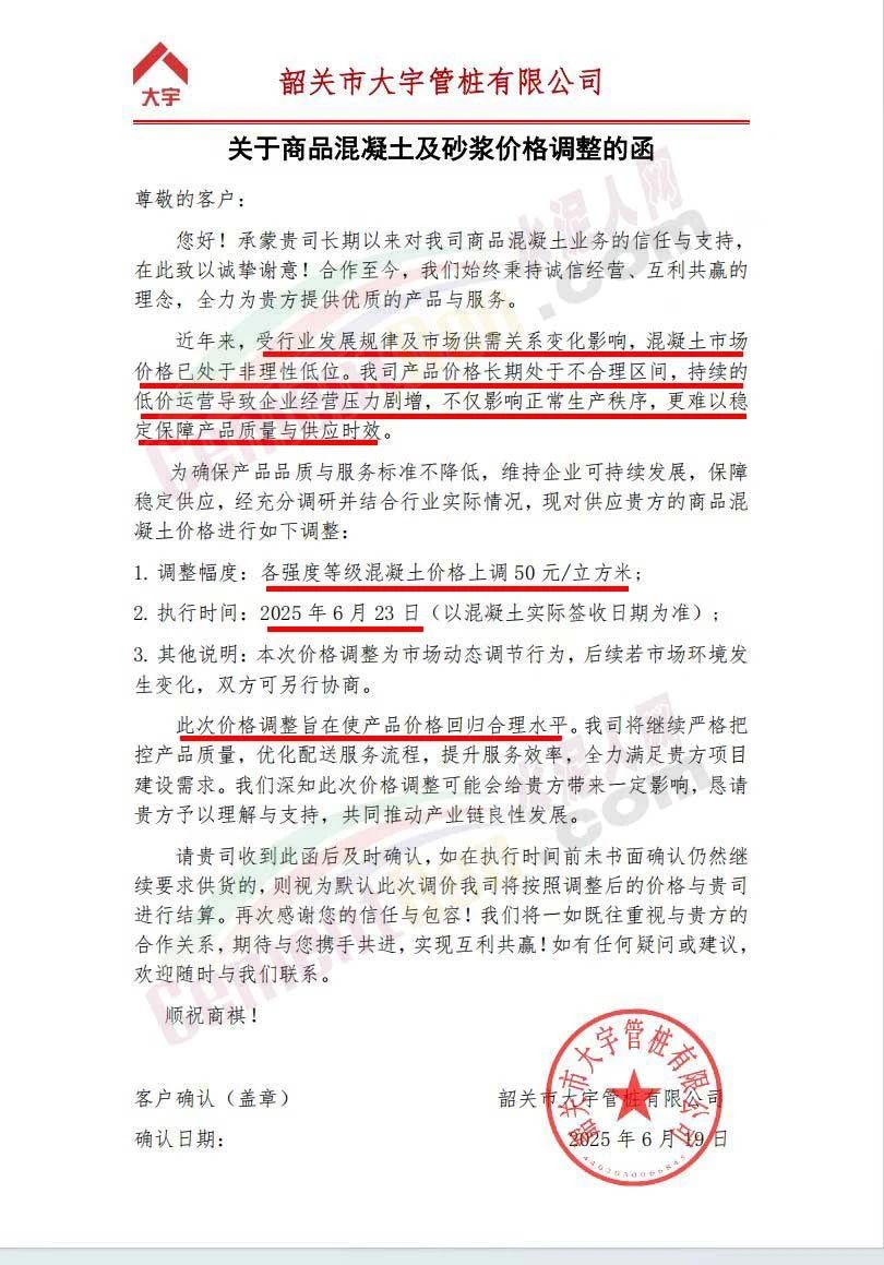 近日,乳源瑤族自治縣宏建商品混凝土有限公司、韶關市城興住宅工業有限公司、韶關市三創混凝土有限公司等近10家商品混凝土企業聯合發布調價函,宣布自2025年6月23日起,各強度等級混凝土價格統一上調50元/立方米。這一舉措不僅引發了行業震動,更被視為混凝土企業在長期低價競爭后的一次“絕地反擊”。