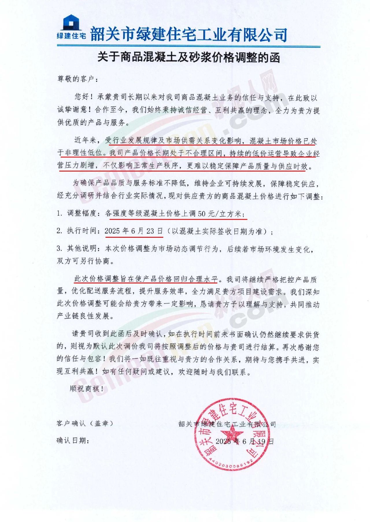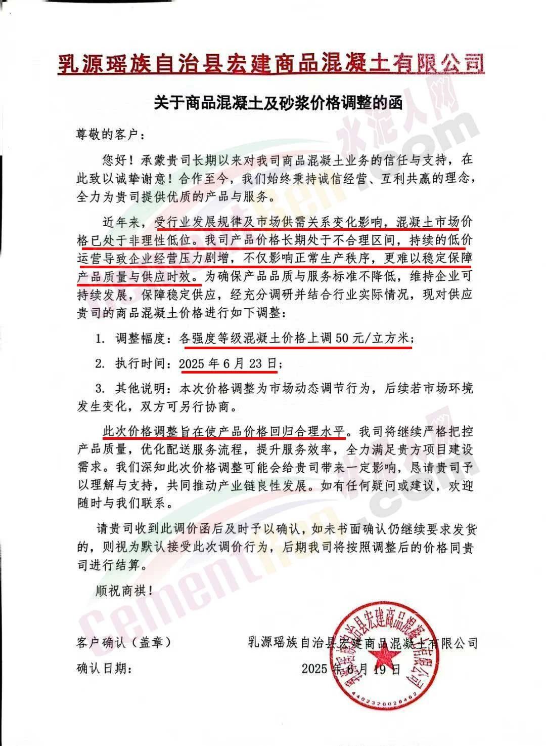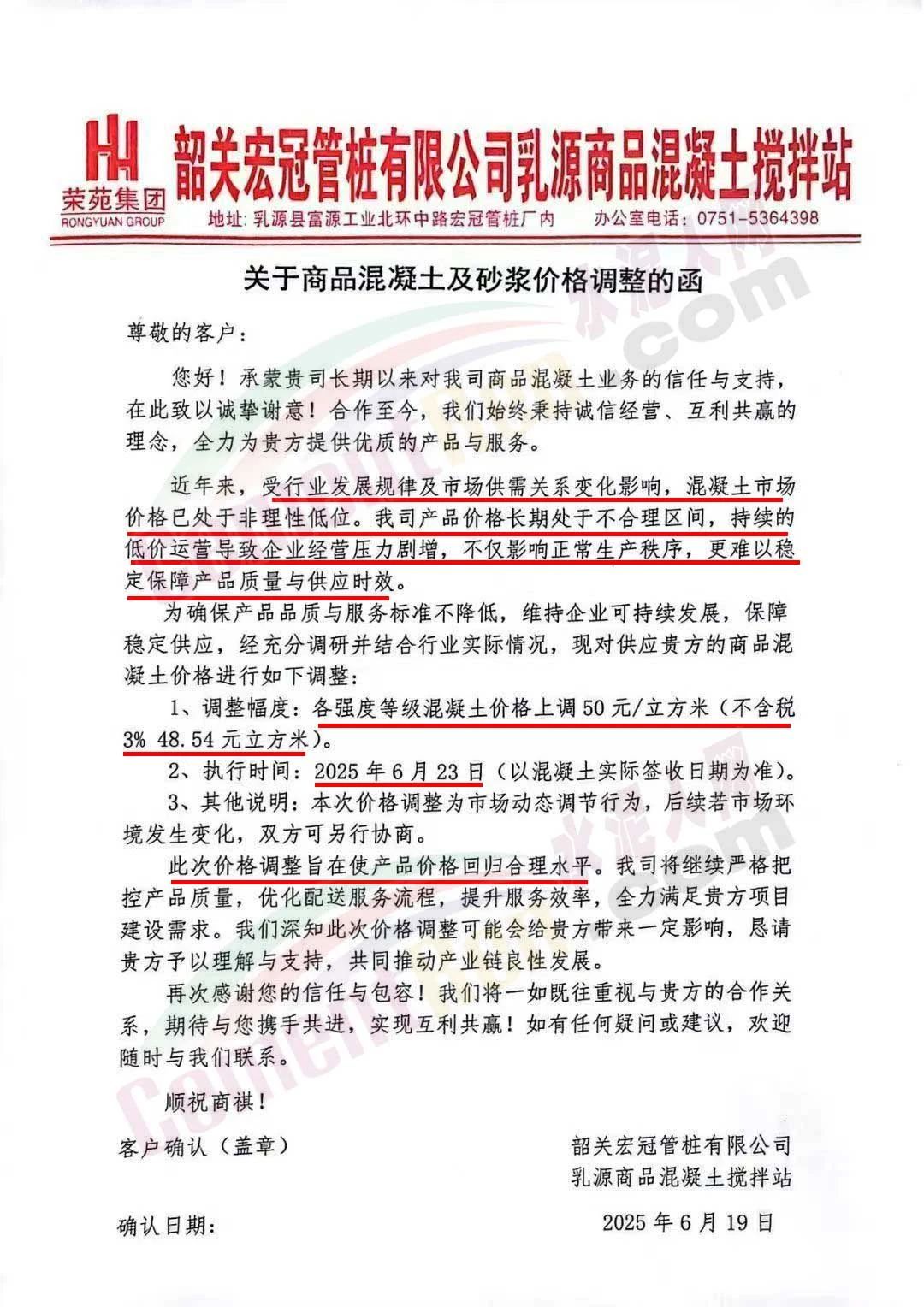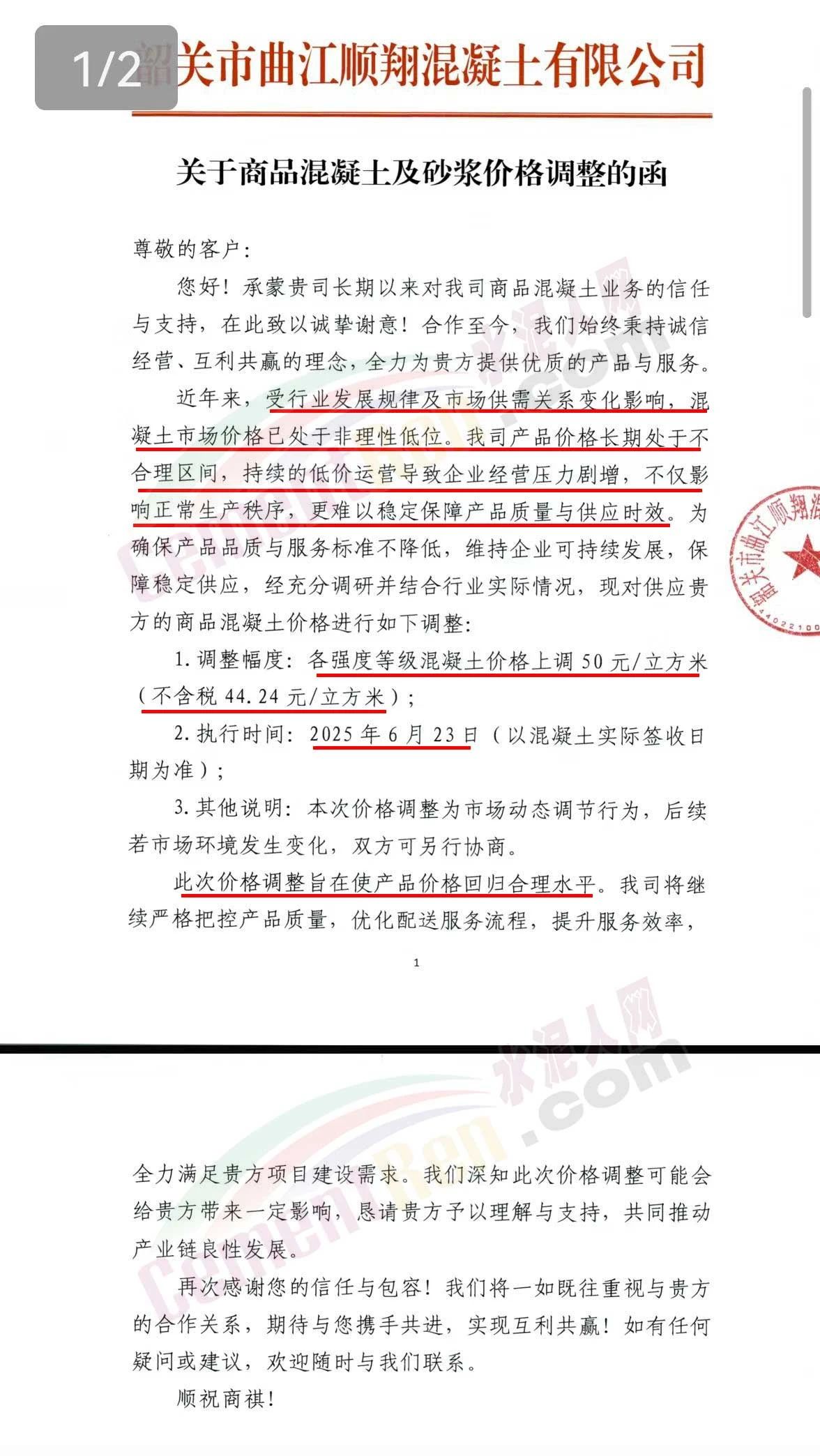 近日,乳源瑤族自治縣宏建商品混凝土有限公司、韶關市城興住宅工業有限公司、韶關市三創混凝土有限公司等近10家商品混凝土企業聯合發布調價函,宣布自2025年6月23日起,各強度等級混凝土價格統一上調50元/立方米。這一舉措不僅引發了行業震動,更被視為混凝土企業在長期低價競爭后的一次“絕地反擊”。