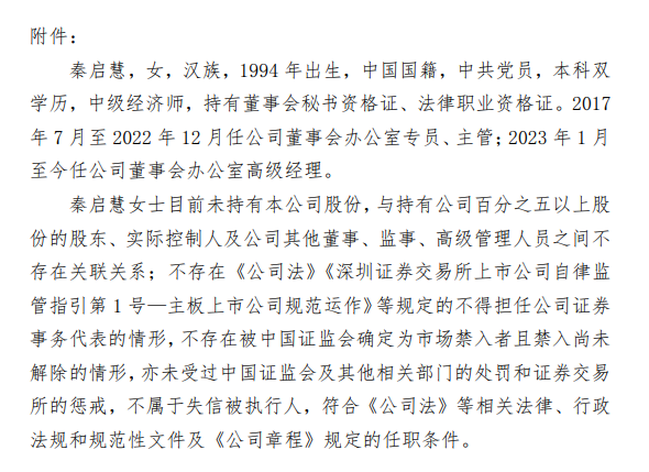 其簡歷顯示:秦啟慧,女,漢族,1994年出生,中國國籍,中共黨員,本科雙學歷,中級經濟師,持有董事會秘書資格證、法律職業資格證。2017年7月至2022年12月任公司董事會辦公室專員、主管;2023年1月至今任公司董事會辦公室高級經理。