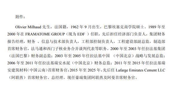 6月25日,華新水泥發布公告稱,經公司董事會會議審議并投票表決,選舉Olivier Milhaud為公司第十一屆董事會董事,任期與本屆董事會一致。根據公告,Olivier Milhaud,法國籍,1962年9月出生,巴黎埃塞克商學院碩士。