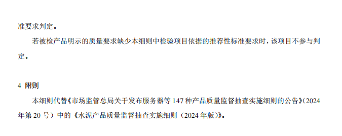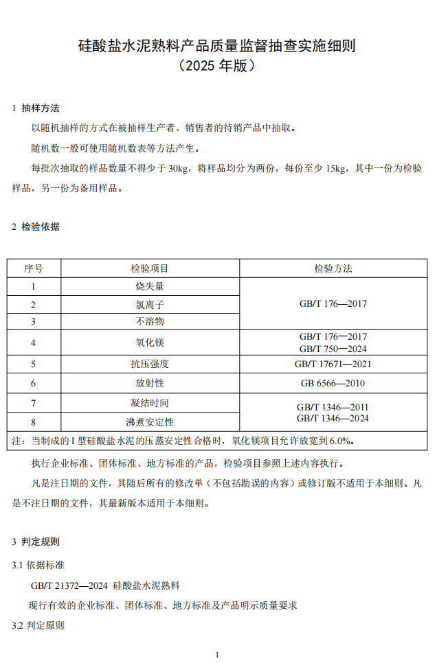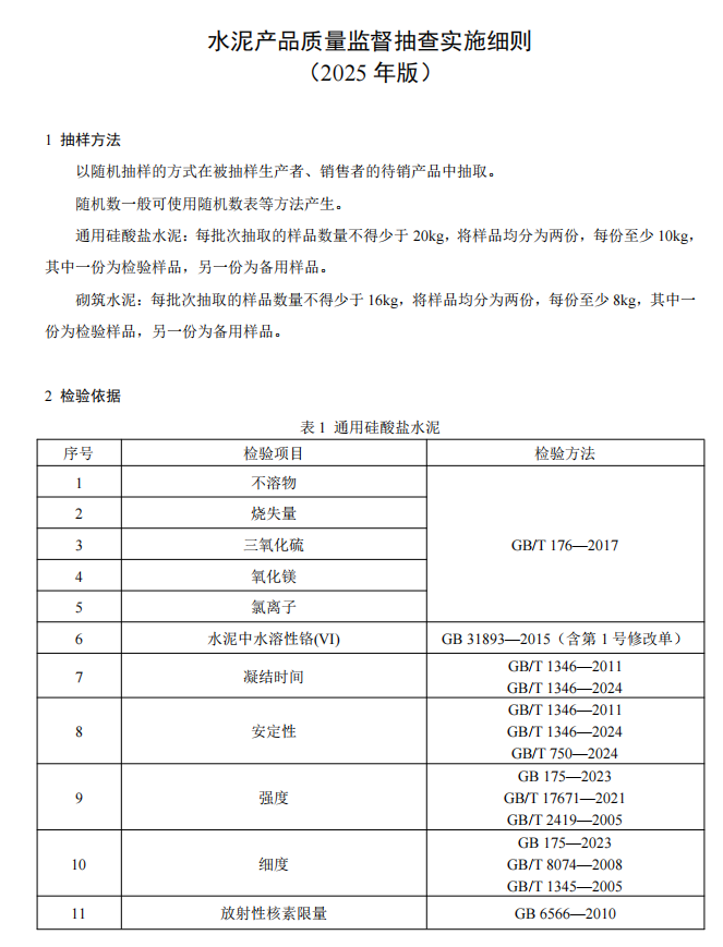 水泥人網注意到,市場監管總局同期發布的還有水泥及熟料產品2025版產品質量監督抽查實施細則公告,并表示自發布之日起實施,各地市場監管部門在開展產品質量監督抽查時可直接采用。此前發布的同種產品監督抽查實施細則同時廢止。