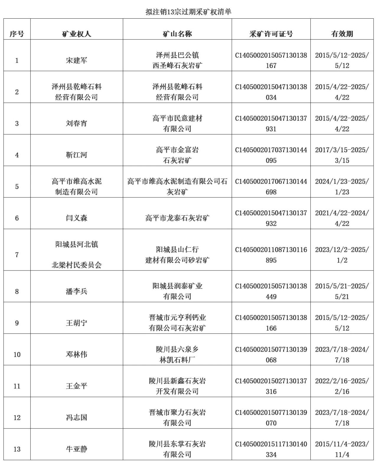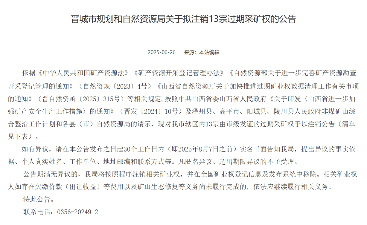 日前,山西晉城市規劃和自然資源局發布公告文件稱,依據相關文件通知,對市轄區內13宗由市級發證的過期采礦權予以注銷公告。