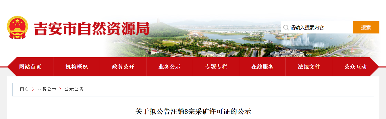 同期吉安市自然資源局發布關于擬公告注銷8宗采礦許可證的公示稱,擬對8宗采礦許可證予以注銷。
