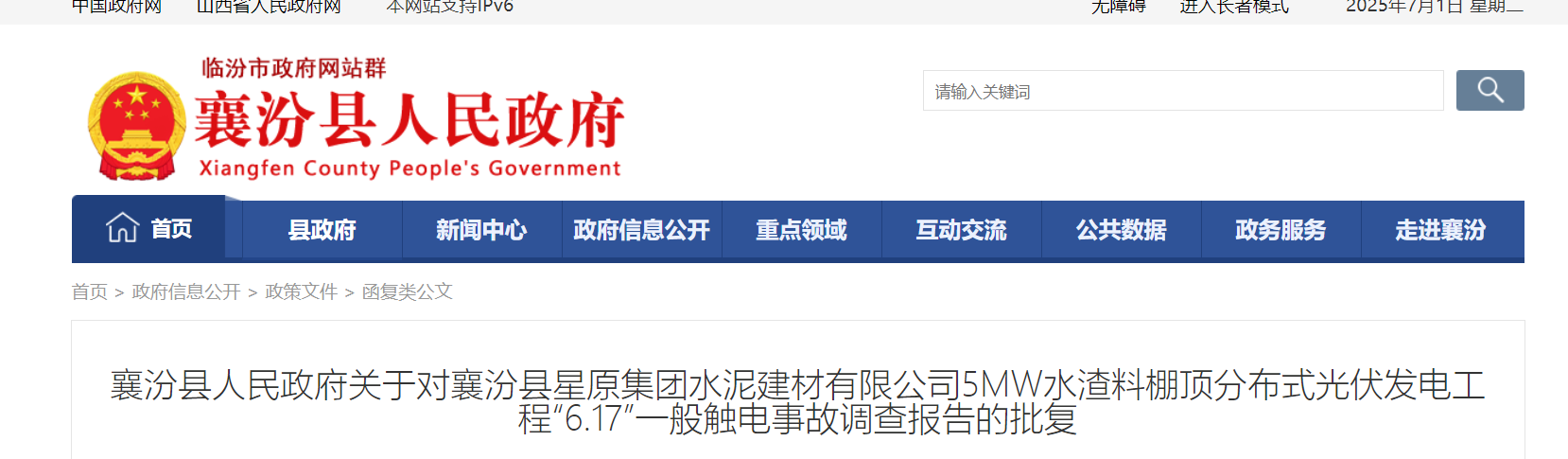 《襄汾縣星原集團水泥建材有限公司5MW水渣料棚頂分布式光伏發電工程“6·17”一般觸電事故的調查報告》全文